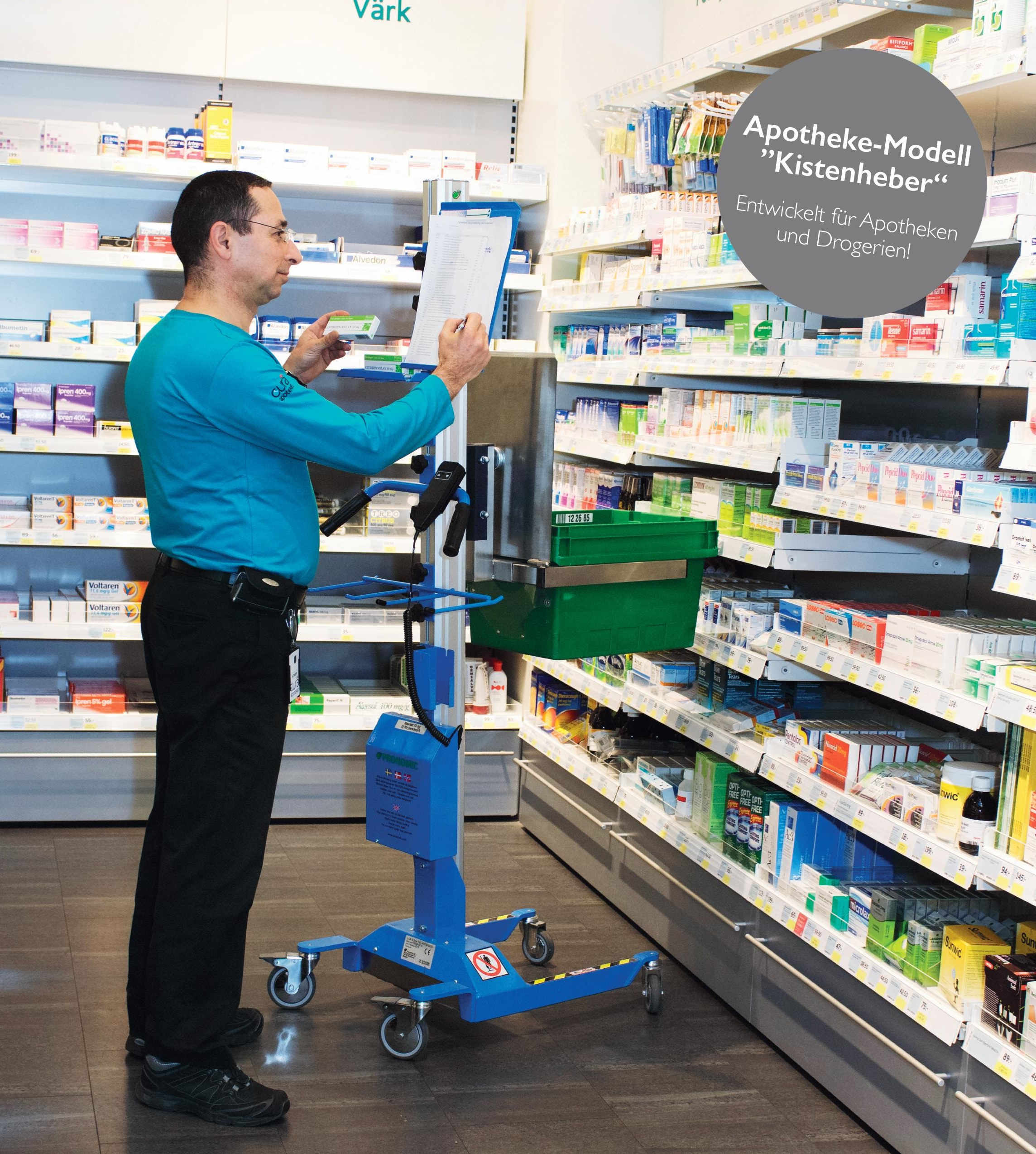 Aufgaben wie das Auffüllen von Regalen werden mit dem Apothekelift zu einer einfachen und Rückenschonenden Tätigkeit.